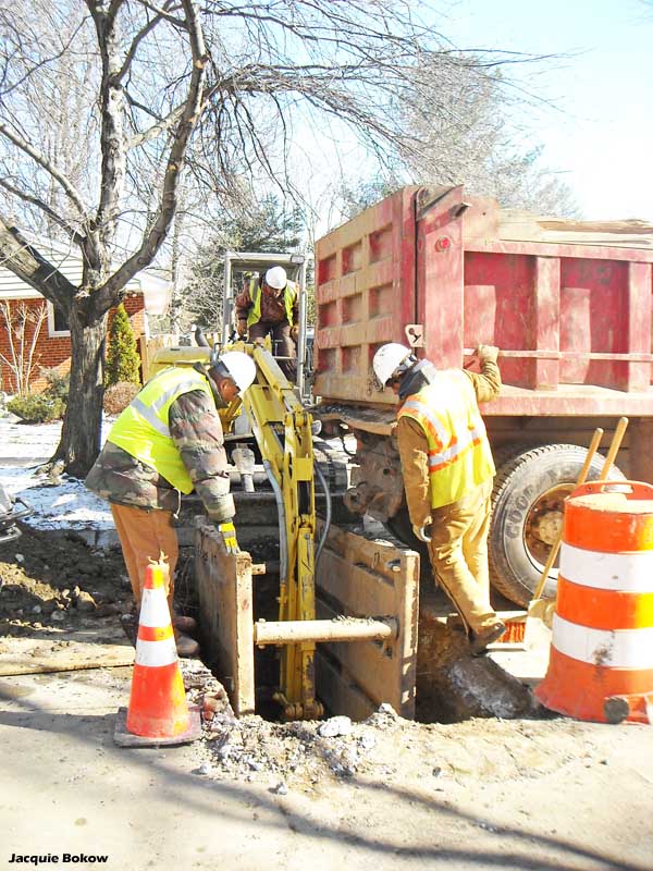 You’ve probably noticed crews around our neighborhood digging up streets and replacing pipes. Rafael Muriel, a foreman for Curt and Sons, Inc. (supposedly in Mount Airy, Md., although there’s no listing), which is subcontracting to WSSC, said they were replacing 60 “laterals,” the sewer pipes that branch out from the main line, to the property line. Mr. Muriel stated that the work was being done because of an EPA complaint of pollution in the Chesapeake Bay due to pipes cracking and leaking.