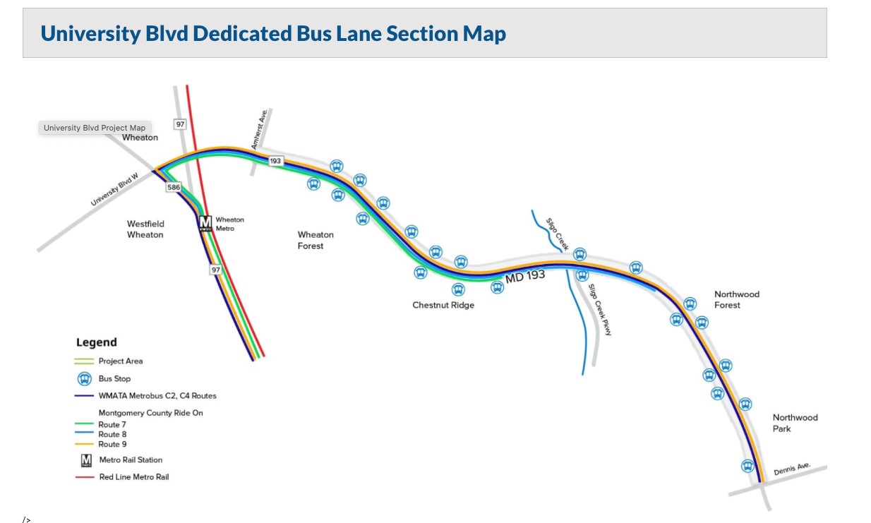 The goal of the pilot is to improve transit times and service reliability for buses and support increased bicycle usage. The dedicated lanes will run east and west in the curb lanes on University Boulevard from Dennis Avenue in Four Corners to Amherst Avenue in Wheaton and will be identified with red painted areas and traffic signage.