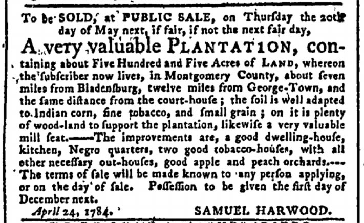 Harwood had owned the property for only a few years, having purchased it in 1780 from the estate of the man who originally patented the lands beginning in the 1730s. Captain John Adamson was a ship’s captain, peruke-maker, and, finally, a planter. In 1751, Adamson had reassured his customers in Annapolis that, even though he had removed to far-off Frederick County (the county this area belonged to at the time), “he furnishes Gentleman with wigs of all sorts, as formerly.” As wig-makers were frequently barbers, naming his first property “Clean Shaving” shows some humor. Adamson used convict servants who probably found him less funny, as he had to offer rewards for several of them and an overseer (“wears his own Hair, of a brownish Colour, tied behind”) who ran away from the plantation in the 1750s and 1760s.