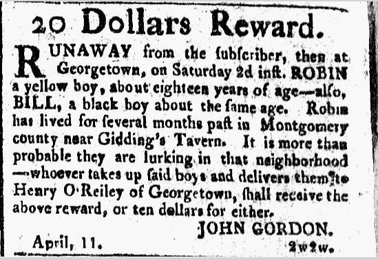 Nonetheless, resistance and retribution continued. Slaves in Calvert County, led by Mark Caesar and Bill Wheeler, armed themselves in July 1845 and marched through Prince George’s, the District, and finally Montgomery County, gathering upwards of 75 men willing to risk their lives in a bid for freedom to the north. One part of the group came up the Bladensburg Road and likely passed Gittings’ Cross Roads on its way, while the other crossed the Navy Yard bridge and took Seventh Street out of the District, met the first group at their intersection and continued north past Rockville. There they were set upon by the Montgomery Volunteers, a white militia. Many of the slaves fled, only to be shot in the back or killed, with 31 arrested. Such was the swift and violent treatment of those without legal rights.