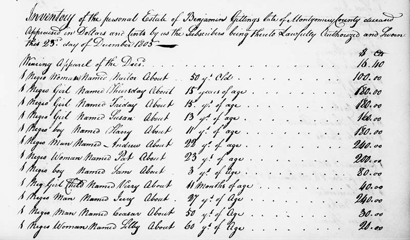 Within days of his death in late 1847, a female slave he had owned named Mary Emily was arrested in Washington on a charge of arson. The U.S. attorney agreed to not prosecute the case, provided she was sold out of the District. The executor of the estate, son Jedediah Gittings, agreed. He sought and the Montgomery county court decreed that he “sell the said Negress Mary Emily for the best price that can be had for her either at public or private sale and that he report said sale” to the court when completed.
