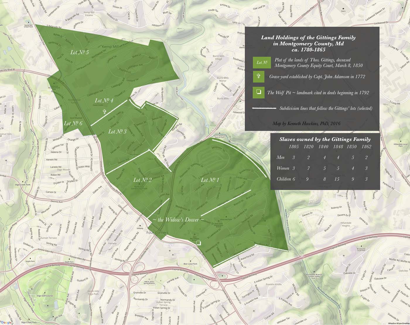 The death of Major Gittings and the division of his estate dispersed his family members though, unlike their slaves, they profited from the event. It also left markers in the area that remain today. His wife and children could not agree on the division of the land — 823 acres (over a square mile) — so they consented to a decree of the Montgomery County Court, acting as a court of equity, on March 8, 1850. William Veirs Bouic was appointed trustee to act on their behalf. He had the property surveyed into six lots from about 84 to 127 acres and proceeded to sell them and distribute the earnings to the heirs through the court. The largest lot of 191 acres, however, was “laid off as the Widow’s Dower,” and “at the request and by the consent of all parties interested, will not be offered for sale during the life of the widow,” Christianna Gittings.