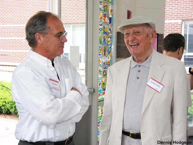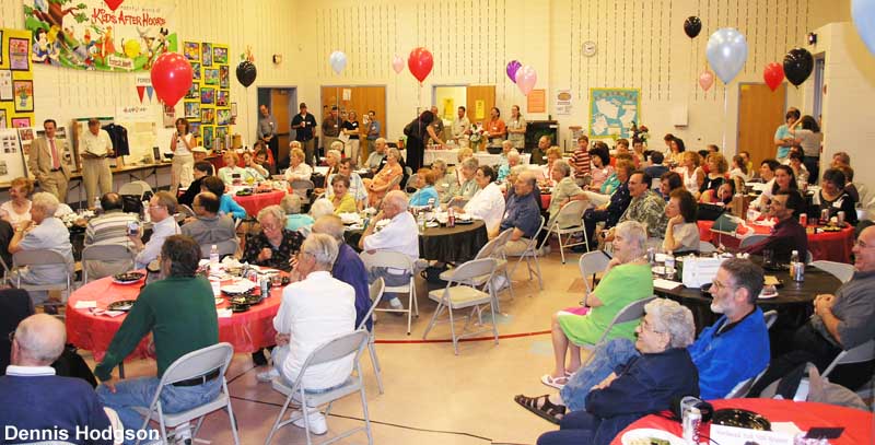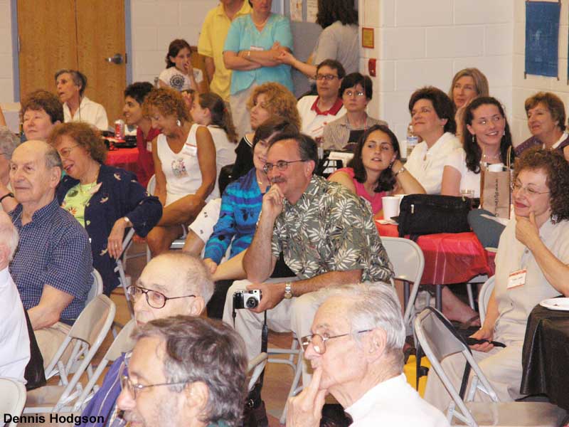 Slogging through mud in the 1950s when their neighborhood had just been carved out of the woods of Maggie Reed’s farm. Standing on license plates and roller skating down Cavalier Drive. Crawling through sewer pipes. Playing touch football and wiffleball in Cavalier Court. Sharing community-owned drill, ladder, lawnÂmower, and floor polisher. Fathers babysitting other kids as part of the “Sitters Club.” Former neighbors shared these and many other vivid memories at a 50th anniversary reunion and party held May 30 in the all-purpose room at Forest Knolls Elementary School. The event celebrated the unique history of the 44 brick ramblers on Cavalier Drive and Belton Road, which were built by a member-run cooperative. About 120 current and former neighbors attended the party, with some guests coming from as far away as Arizona, California, Washington State, Florida, Massachusetts and London, England. The photos — by Dennis Hodgson, son-in-law of the Gershensons (see original owner Leo Gershenson in red shirt) — tell it all!