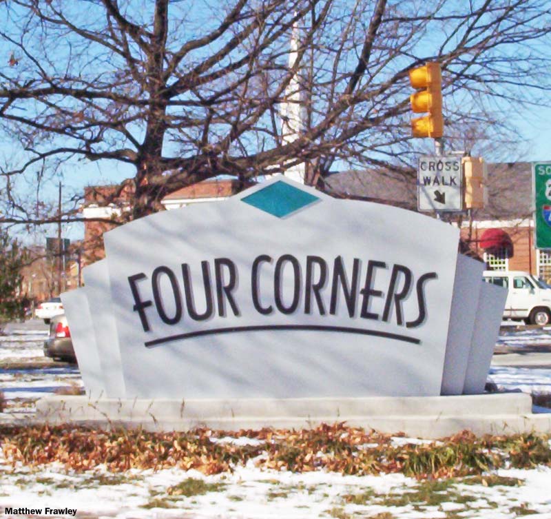 I’m sure we’ve all noticed the new “Four Corners” signs that were installed on the medians where University Blvd. splits on either side of Colesville Rd. They are Art Deco in style and light up at night.