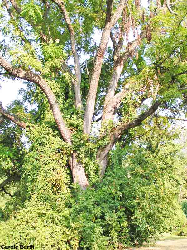 Invasive plants cover the huge black walnut tree, shown in both photos here, in North Four Corners Park.