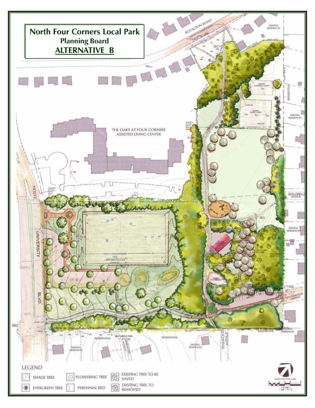 On December 6, the Planning Board directed staff to try yet another redesign of the Olympic-sized adult soccer field proposed for North Four Corners Park. The Commissioners asked to see a design where the field would be built against the property line between the Oaks and the meadow. In other words, instead of placing the field at a diagonal in the middle of the property, this design would place the long side of the rectangle along the property line. The Commissioners proposed this ostensibly to save more trees and to provide more of a buffer between the field and the houses on Timberwood and Pinewood.Staff has responded with two versions of this option (each with a different parking lot configuration). Here is a link to the designs: cc.bingj.com/cache.aspx?q=fourcorners_park.shtm&d=4911638911714965&mkt=en-US&setlang=en-US&w=qfEb9NJ0BaC5jjSH4H5YtQu1WQZ5_eOk. [Note: original URL is no longer active.] (Alternative B is shown at left). This rearrangement, however, does not address community concerns. Due to the massive size of the field and the hilly terrain, these alternatives would still require massive earthmoving and would still destroy the existing trees. Moreover, this East-West field orientation would mean one team is looking into the sun. Choosing between these new designs and staff’s latest preferred design (which is almost the same as their last version) is essentially meaningless. It’s like choosing what color and model of bulldozer they use; the end result is still destruction of the meadow.