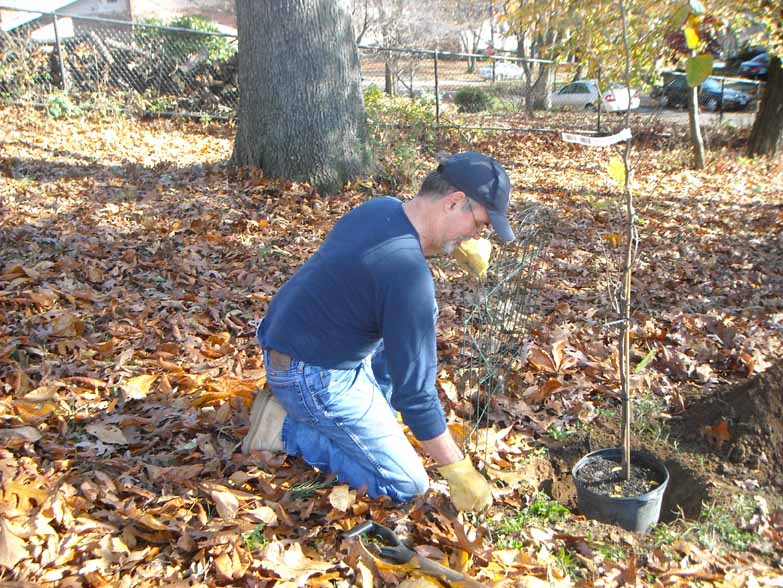 The trees were donated through a project called Trees for Schools, a joint initiative of Tree-mendous Maryland (Maryland Department of Natural Resources’ Forest Service) and the Sierra Club. Lill knew about this possibility from her work with other schools; Nielsen contacted them and negotiated the offer. They have now donated a total of 22 native trees to FKES (two planted last spring, a redbud and a white oak). The November planting was 10 redbud, one willow oak, three river birch, three old-mans-beard (a lesser-known small flowering tree known for its white fluffy spring flowers), and three dogwood. All are natives of our region; you could find examples of most of these growing in our neighborhood’s forest along the Northwest Branch.