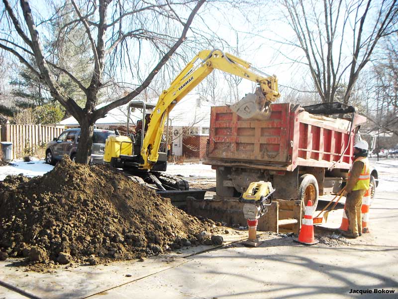 You’ve probably noticed crews around our neighborhood digging up streets and replacing pipes. Rafael Muriel, a foreman for Curt and Sons, Inc. (supposedly in Mount Airy, Md., although there’s no listing), which is subcontracting to WSSC, said they were replacing 60 “laterals,” the sewer pipes that branch out from the main line, to the property line. Mr. Muriel stated that the work was being done because of an EPA complaint of pollution in the Chesapeake Bay due to pipes cracking and leaking.