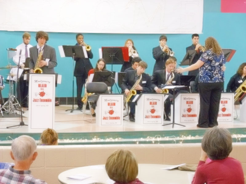Montgomery Blair High School Tri-M Music Honor Society Chapter #4407 hosted its first annual “Swingin’ Sounds for Senior Citizens” event on 19 February. Residents from nursing homes, assisted living, and the Silver Spring senior community were treated by both the Jazz Lab Band and Honors Jazz Band to the music of Glen Miller, Artie Shaw, Benny Goodman, Duke Ellington, Cole Porter, and more.