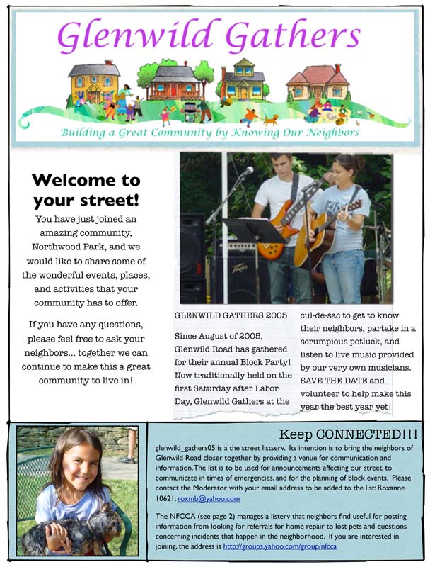The flyer, called “Glenwild Gathers,” also informs them of the street’s annual block party, which has been held since August of 2005. The block party was started by Beltran.