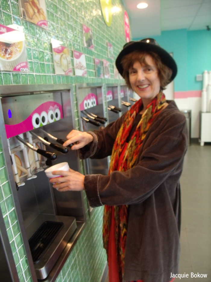 “Welcome to Sweet Frog,” said a friendly young woman behind the counter. Her name was Jaya Shelton and it turned out she was the manager. I told her I had no cash with me and just wanted to look around but would return very shortly with my wallet. Shelton, whose pink and green sweater matched the color scheme of the walls, said I could have a cup of yogurt on her. I thanked her profusely and got going. There were seven self-service dispensing machines, two flavors per machine. I managed to squeeze chocolate, cappuccino, and crème brûlée into my cup. The chocolate and cappuccino were nice enough, but the crème brûlée was excellent. And here’s the thing: all the yogurts I sampled tasted rich and creamy, just like real ice cream, although Shelton said they were made with two percent milk.