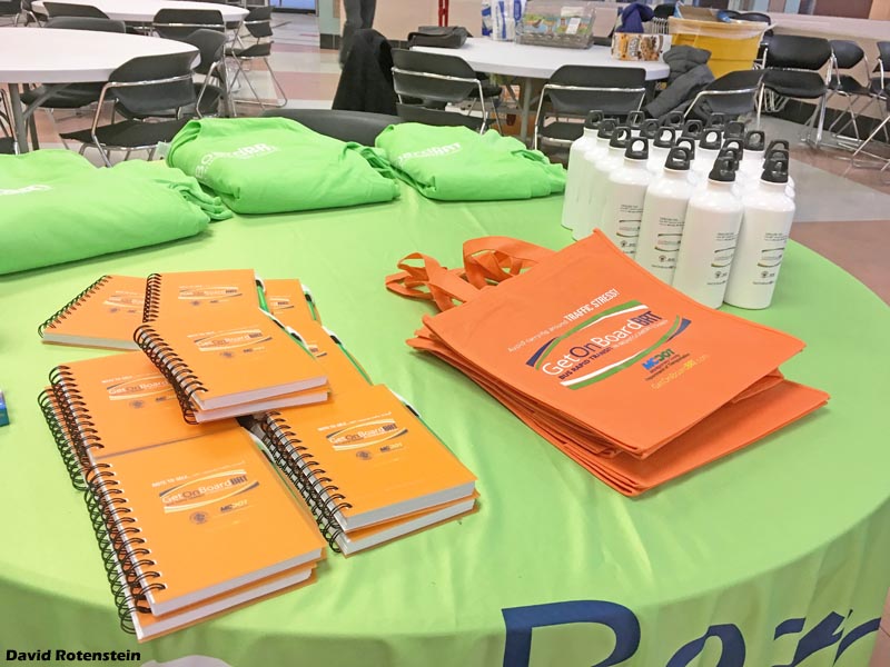 The open house included a “kid’s stop” where children could color buses and navigate a paper maze as well as a swag table where visitors who got stickers at all four of the “stations” could get a BRT water bottle, tote bag, or t-shirt emblazoned with the county’s “Get On Board BRT” logo. There also were two videos playing in a continuous loop explaining what BRT is and how the system works.