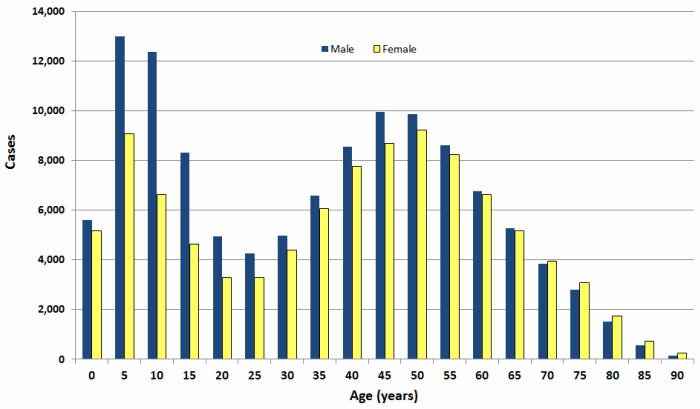 Reported cases of Lyme disease are most common among boys aged 5–9, second most common among boys aged 10–14.Lyme disease is caused by the bacterium Borrelia burgdorferi and is transmitted to humans through the bite of infected blacklegged ticks (also called deer ticks, Ixodes scapularis). Because of the large number of deer browsing and bedding down in local gardens, our neighborhood has had numerous people struck by this disease.