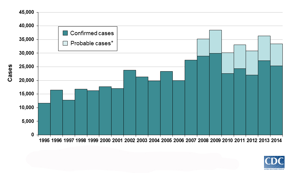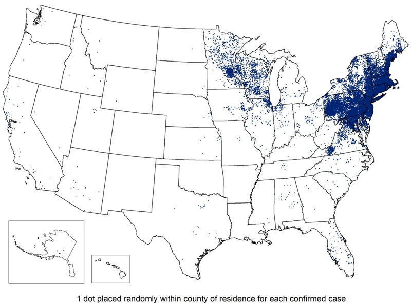 We live in an area known for Lyme disease. In 2014, 96 percent of confirmed Lyme disease cases in the U.S. were reported from only 14 states, including Maryland. For the past 11 years, Maryland has been steadily decreasing its number of confirmed cases; in 2014 it was responsible for 16 percent, ranking 13th in the nation (in 2009, the year with the greatest number of cases nationwide, it ranked 7th).