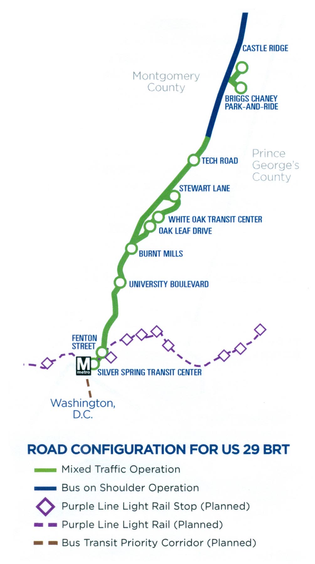 This express service differs from the much-heralded RideOn Extra service recently announced for Route 355/Rockville Pike. Instead of implementing BRT on that route, the County decided to invest in a much lower-cost option, which is essentially MetroExtra but operated by the County. New buses have been purchased and equipped with Wifi, phone chargers, and transit signal priority service. This is exactly what could have been implemented on Route 29 at a fraction of the cost.