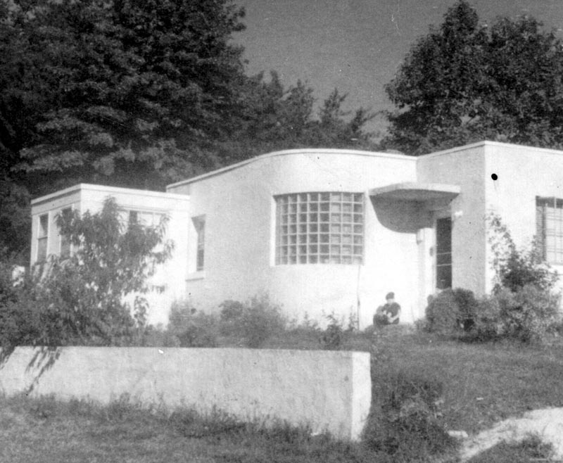 The finished product was a small, rectangular plan, one-story building constructed on a concrete slab foundation. Distinctive exterior elements include metal casement windows and a curved corner with glass blocks lighting the dining room. A rounded projecting slab covers a terrace leading to the front door (south facade). The stucco-clad exterior lacks ornamentation except for broad window sills, concrete coping along the roof, and a slight inset in the east (front) facade demarcating the break between the living room and master bedroom that provides some relief in the minimalist facade. The interior originally had a living room, dining room, kitchen, utility room, one bathroom, and two bedrooms. Shortly after moving into the house, the family constructed a one-story bump-out addition extending from the south facade.