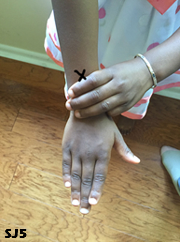 of your child’s fingers above the wrist in the middle of the two bones, the ulnar and the radius.