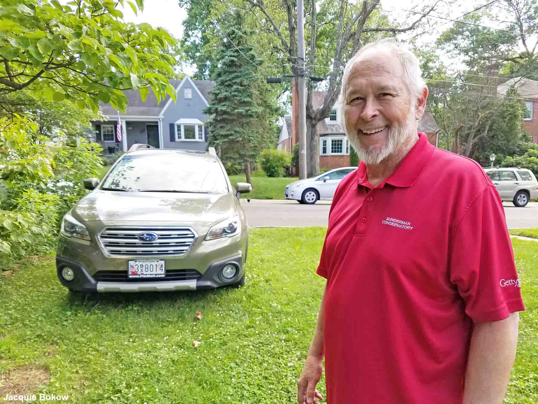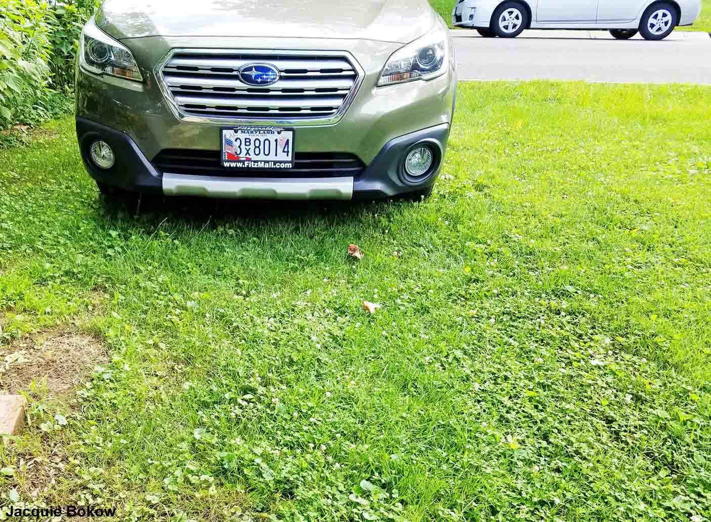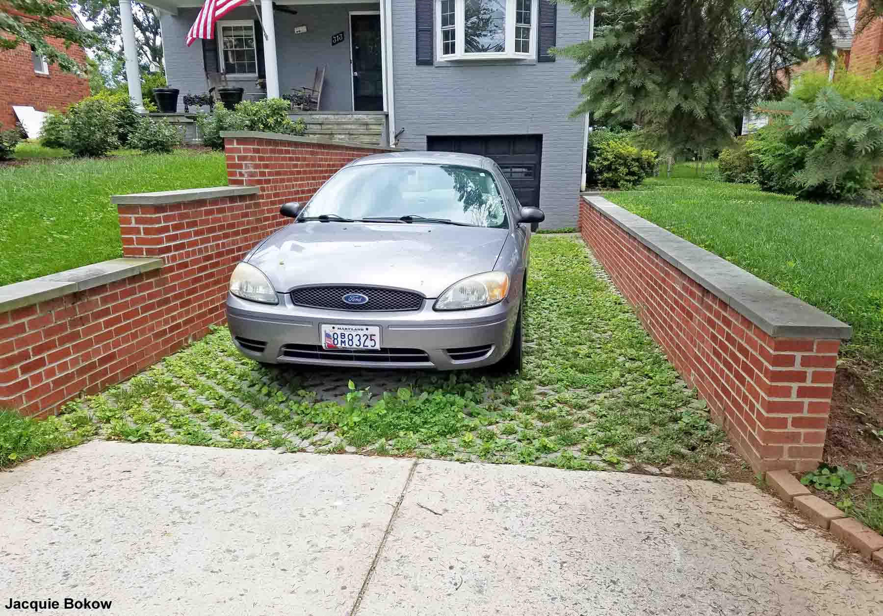 “The [recycled plastic mesh] type of grass paver installation will not support green, growing grass when a vehicle is regularly parked on it,” cautions Guenther. “The grass will not get sunlight beneath the car, and the location of the car wheels will compress and damage the grass beneath it when a vehicle is parked on this surface.“This driveway looks no different than our front lawn,” said Guenther, “and retains and drains water in rain storms rather than draining the water into our backyard or into the street gutter and storm sewer.”