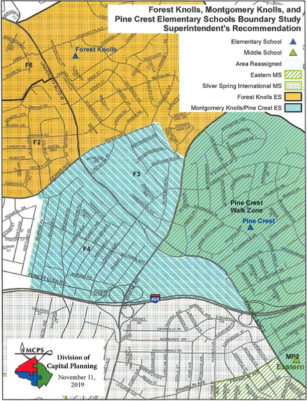 On 26 November 2019, the Montgomery County Public Schools Board of Education voted on new boundaries for Forest Knolls Elementary School. The Board’s decision reassigns a portion of the Northwood/Four Corners neighborhood to Montgomery Knolls (Pre-K through second grade) and Pinecrest (third grade through fifth grade). The reassigned portion of our neighborhood is labeled “F3” in the map below.