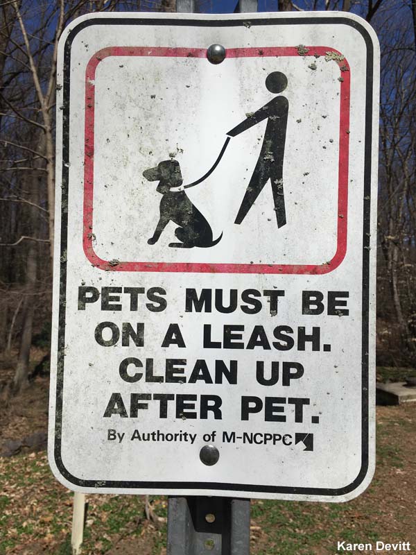 Another dog-lover friend of mine, K.R., is a proponent of having some off-leash time on the Rachel Carson Greenway Trail, preferably in the early a.m. when it is less crowded. She also reports that, on her walks in Sligo Creek, most dogs she sees are leashed. More signage throughout the park was suggested as one way to raise awareness. There is currently a sign at the entrance to the park on Lockridge Drive (seen above).
