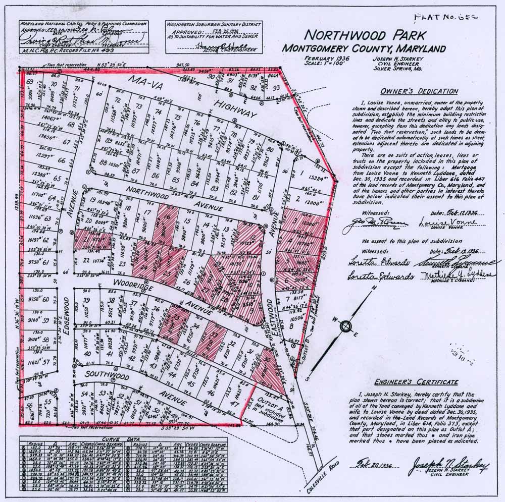 4 Montgomery County Circuit Court, Subdivision Plats, Maryland State Archives (hereafter MSA): Northwood Park, MSA s1249-008463, Plat no. 652, Feb. 17, 1936; Northwood Park 1st Addition, MSA s1249-008549, Plat no. 738, Sept. 25, 1936; Northwood Park 2nd Addition, MSA s1249-008585, Plat no. 774, Jan. 21, 1937; Woodmoor blocks two and three, MSA s1249-008594, Plat no. 783, Feb. 18, 1937; Woodmoor blocks four and five, MSA s1249-008608, Plat no. 797, Mar. 4, 1937. Accessed at https://mcatlas.org/plats/, May 15, 2021.
