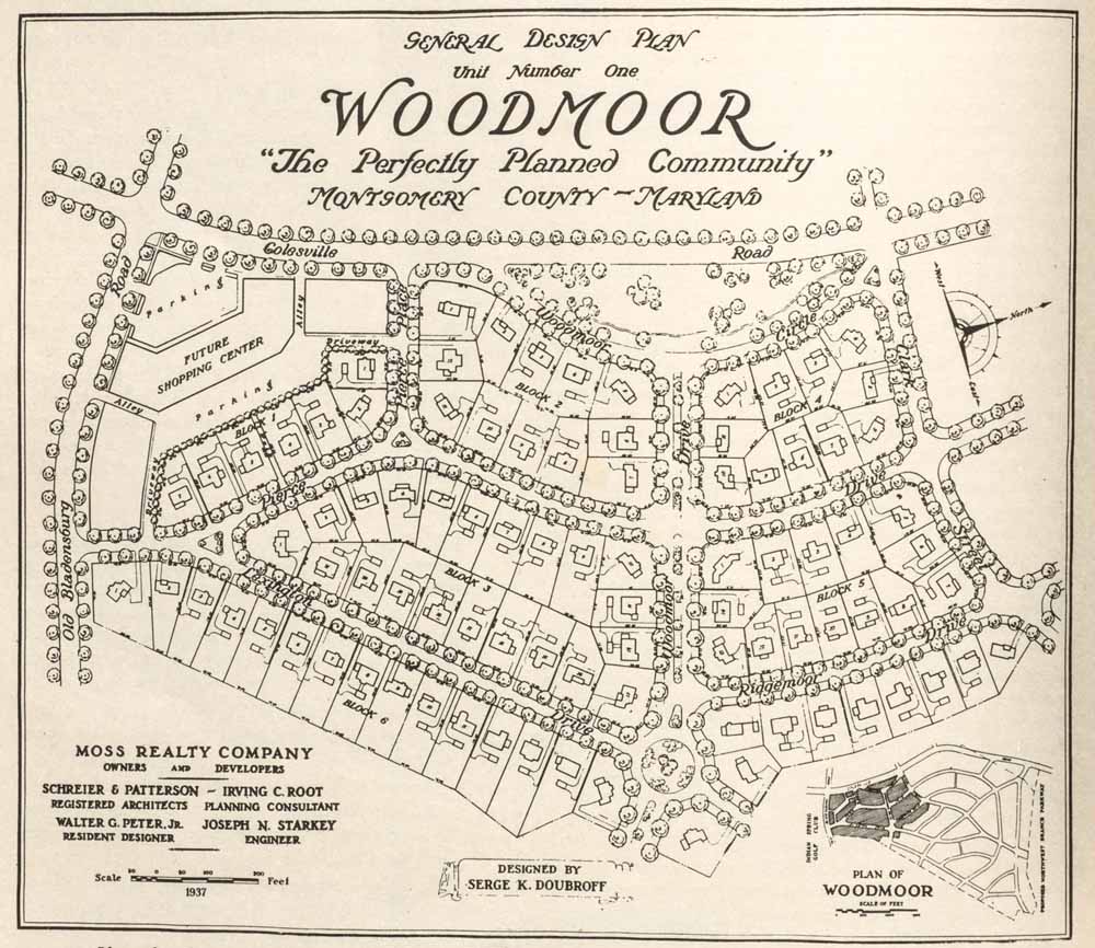 George J. Moss, who had developed real estate in the area since the 1920s, acquired the property and developed it in 1937 as Woodmoor. He promoted it with zeal, touting its ties to M-NCPPC staff, even creating radio advertisements for it on a District station, dubbing it “The Perfectly Planned Community.” All this was for a specific clientele: Whites who qualified for FHA-insured mortgages. As Moss proclaimed in the Washington Evening Star in September 1937: