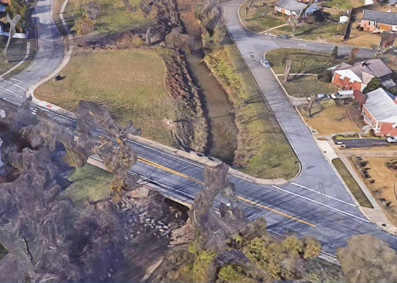 If you drive south on Dennis Avenue to get to Georgia Avenue, you’ll have to detour five miles into Wheaton next summer. The bridge on Dennis Avenue (on the other side of University Blvd., just four blocks this side of Georgia Avenue) which takes traffic over the Wheaton Branch will be replaced; the bridge closure is scheduled to coincide with school summer break, although the flood mitigation won’t finish until winter. Part of the project is flood mitigation for the stream (see photos below).