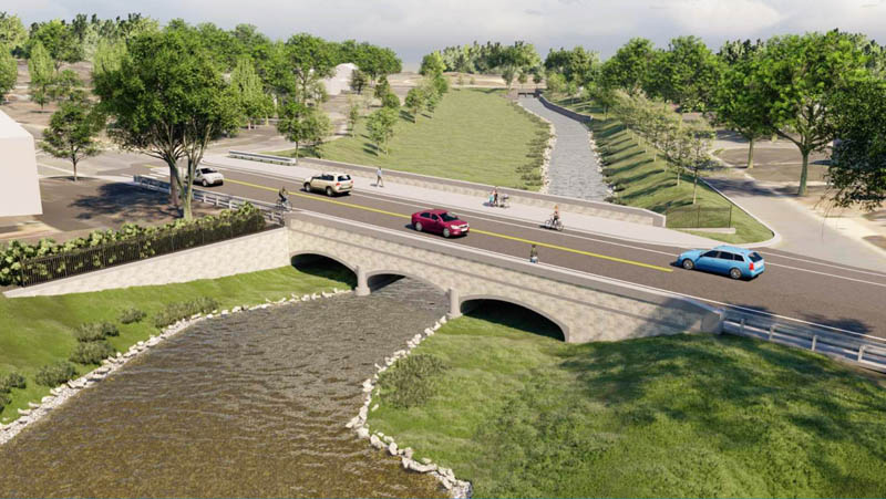 The width of the two lanes, now 15', would be narrowed to 11', but the shoulder would be widened to 5' to allow bicycle traffic and the sidewalks widened considerably, too.