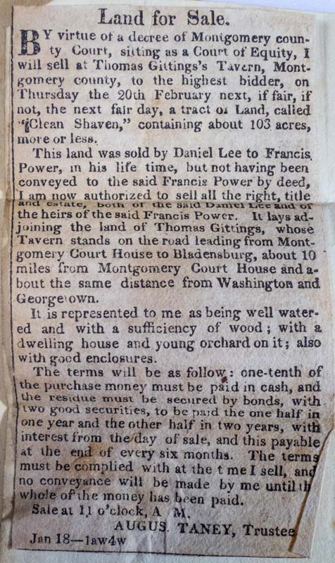 Whether it truly was used long as a rolling road is uncertain, as tobacco quickly exhausted the area’s soil and some planters turned to raising corn and other grains. In any case, it became well-established and used, often appearing in property advertisements with miles distant from those points to help readers locate the eligible sites. Both roads had long histories. In 1831, local Whig assemblyman and enslaver Thomas Gittings steered a bill through to improve the road to Burnt Mills from the north and thence to the Cross Roads near his house. Through the 1840s, the Main Road featured a number of landmarks, including a toll gate, a wolf pit just north of a marsh east of the Cross Roads, and a way to walk to a family burying ground set aside in 1772 as an easement from the adjoining properties, maintained in following deeds until the 1950s.