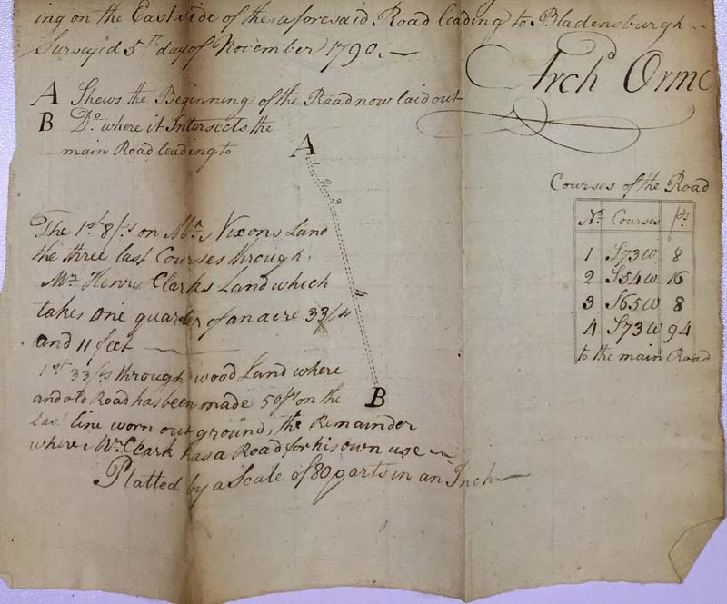 What the petition called the “Bladensburg or Burnt Mills Road” was in fact two separate roads that were among the area’s earliest and formed its distinctive cross roads. While themselves passing through and beyond the area, these two roads tied it closely to the transport of slave-produced tobacco, grains for milling, white suburbs, and today’s rush hours. Of the two, the earliest was the road coming from the south (and ultimately Georgetown) to the mill seat on the Northwest Branch established by Samuel Beall, Jr., in the 1740s. His son, Walter Beall, operated the mill through the 1790s and the road leading to it was referred to as reaching his place. The rolling road that crossed it followed the highest levels between the Sligo and Northwest Branches to reach the tobacco port at Bladensburg, about eight miles to the south and east. After Montgomery County was established in 1776, it became known as the Main Road, running from Montgomery courthouse to Bladensburg.