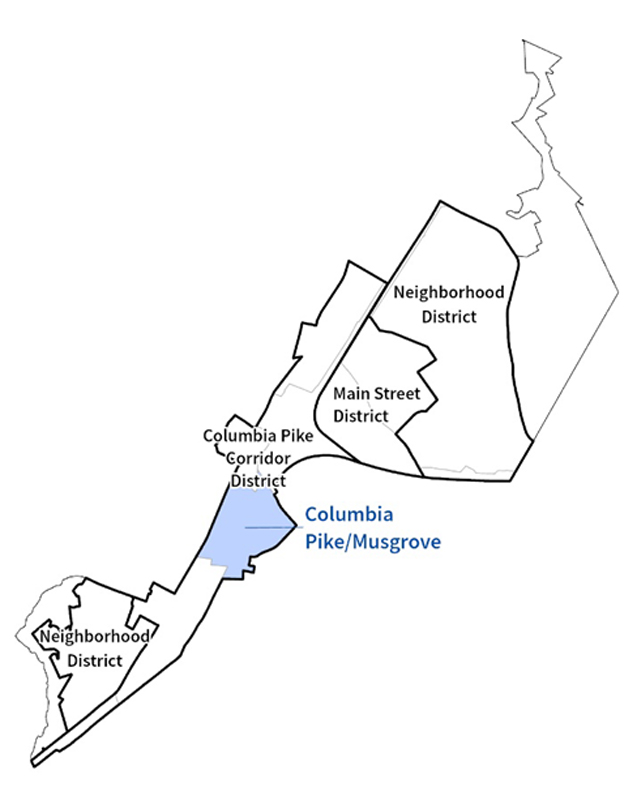 The Plan identifies the following districts: Columbia Pike Corridor, Main Street Corridor, and Residential Neighborhoods.