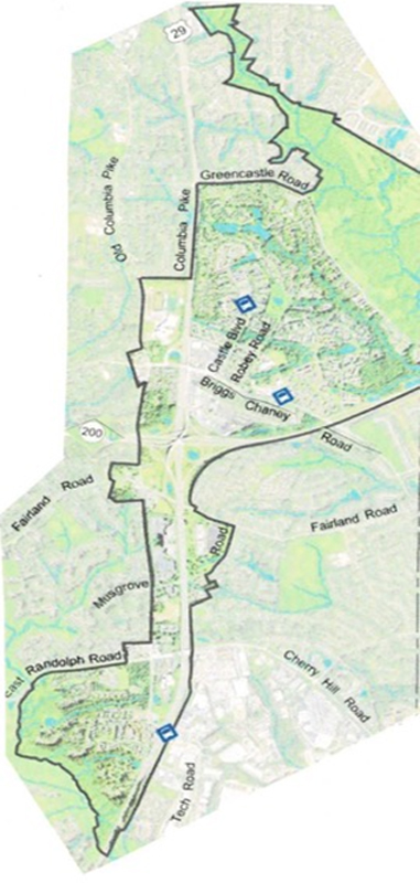 On the transportation front, the Plan observes that U.S. Route 29 is the third busiest road in Montgomery County (after I-270 and I-495), which serves as a main north-south link. Intersecting MD 200 (the Intercounty Connector) and Briggs Chaney Road offers east/west connectivity. The plan recommends further enhancement of Flash Bus Rapid Transit (BRT) service between Burtonsville and Silver Spring with dedicated median bus lanes. The Plan also calls for studying the feasibility of “road diets” to reduce the number of lanes on arterial roads, including Briggs Chaney Road, Fairland Road, East Randolph Road, and Old Columbia Pike. Another idea for study is installation of roundabouts at signalized intersections along Briggs Chaney Road.