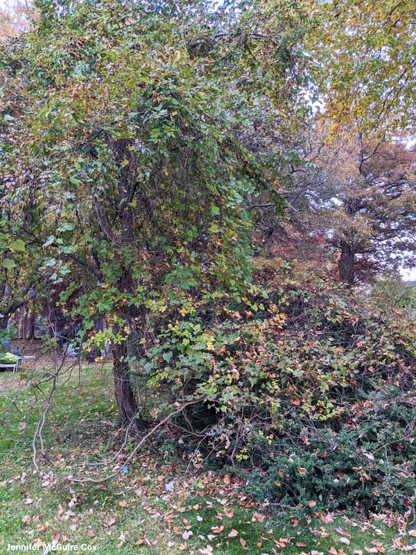 Porcelain-berry taking over shrubs and trees in a yard in our own neighborhood.