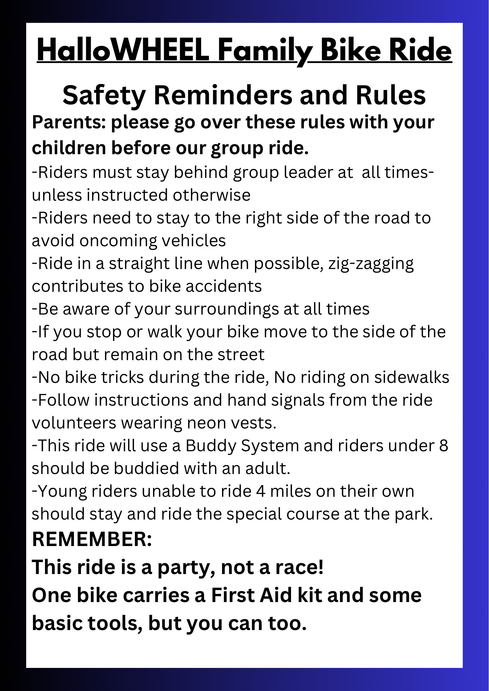 This event welcomes all! It is always fun to have neighbors that come not necessarily to ride but to hang with us at the park so whether you are a rider or not we hope that you can join the fun one last time this year!We have a couple of rules to keep us as safe as possible: kids should ride their bicycles along and to the right of their responsible adult to keep our younger riders at safe distance from the vehicular traffic. We also ask you to not ride ahead of the leader wearing the neon vest at the front of the group, and please wait for the green light and the go-ahead to cross University and Dennis as a group. Lastly, we ask that riders keep the pace and stay in formation.